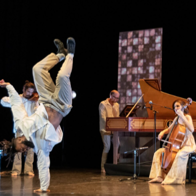 FugaCités est une rencontre entre la musique baroque et les cultures urbaines. Ce sont trois variations poétiques et interdisciplinaires aux multiples inspirations, un dialogue créatif entre les instrumentistes du Concert de l’Hostel Dieu et trois artistes-phare des cultures urbaines : Tiko (human beatbox), Mehdi Krüger (slam), Jérôme Oussou (danse hip-hop) chorégraphié par Mourad Merzouki.